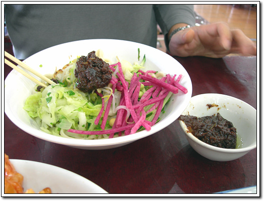 짜잔.. 드뎌 이것이 북경작장면입니다. 음식을 나르는 방식부터 좀 특이한데.. 먼저 면만 담긴 그릇과 작은 그릇에 각종 채소를 별도로 담아 나옵니다. 손님 앞에서 그 작은 그릇에 담긴 채소들을 면 위에 휙휙 마치 쇼를 하듯 일사불란하게 넣습니다. ^^ 이때 소리도 아주 경쾌합니다..^^ 그리고 손님 앞에 춘장(베이징식 작장)과 함께 내려놓습니다. 처음 볼 때는 약간 두렵습니다. 좀 지저분해보이기도 하고 북경식 작장도 그냥 된장 같아서 먹어보기 좀 난해한데 쓱쓱 비벼서 한 입 먹어보면 모든 편견은 사라지고 맛의 진수를 느끼실 수 있습니다. ^^