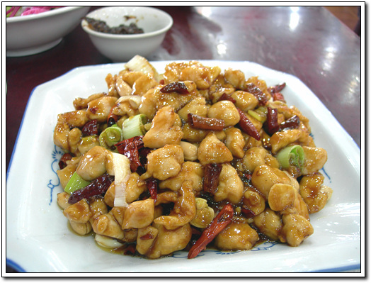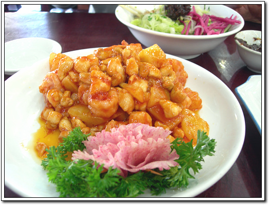 두 번째는 새우탕수육. 이거 아주 명물입니다. 정말 맛있습니다. 우리네 탕수육과 아주 닮았는데 우리의 탕수육처럼 전분 즉, 소스가 많지 않아 끈적이지 않았고 파인애플과 새우 그리고 순살 닭고기와 각종 견과류가 씹히는 맛이 예술이었습니다. 이것과 함께 나왔던 사천식의 비교적 매운 닭요리도 고추를 기름에 살짝 볶았는데 그 소스와 고추의 알싸하게 매운 맛이 아주 잘 어울렸습니다. 특징은 땅콩과 비슷한 견과류가 통으로 들어가는데 매운 와중에 견과류가 아싹하고 씹히는 맛이 아주 예술이더군요. 특히 견과류를 씹을 때 나는 고소한 향이 전체 맛과 어우러지면서 절묘한 맛이 나더군요.. 정말이지 한국에선 먹어볼 수 없는 맛이었습니다.
