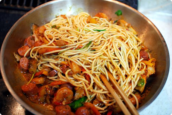 자.. 먹다남은 스파게티를 맛있게 먹는 요령은 다음과 같습니다. 너무 평범한 것이라 참 말하기 뭐하기는 하지만.. ^^ 먼저 팬에 버터나 올리브유를 두르고 냉장실에서 꺼낸 삶아놓은 스파게티 면과 당시 스파게티에 올려 먹었던 채소를 함께 넣고 두르치기를 합니다. 그 다음 남았던 소스를 붙고 함께 더 볶아주죠... 여기에 팁하나는 이 상태에서 먹으면 맛이 좀 떨어지므로 새로운 신선한 재료를 아주 조금만 더 넣어주시면 맛이 확 살아납니다. 저는 오늘 코스트코 장보면서 사온 소시지 두개를 잘라 넣었죠.. 역시 맛이 살짝 살아나더군요.