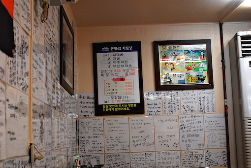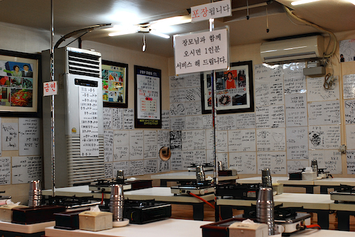 몇 년만인데도 그곳 그자리에 그대로 있더군요. ^^ 이 집 처음 갔을 때의 느낌은 이 좋은 음식을 왜 지하로 내려가서 먹어야할까였는데 여전히 식당은 지하에 있었습니다. 도착 시간이 11시 40분 정도이니 아무도 없고 아주 좋더군요. 잘나간다는 식당의 징표라는 수많은 메모/싸인 종이 사이로 [장모님과 함께 오면 1인분 서비스]라는 글귀가 눈에 쏙 들어옵니다. 에고 그 글귀를 보니 장인어르신 간호하시느라고 고생하실 장모님 생각이 잠깐 스쳐가더군요. (하여간 장모님께 잘해드려야 합니다.. ^^ 이 세상에서 제일 맛있는 김치찌개를 끓여주시는 분이니까.. ^^ 너무 속보이나요.. )