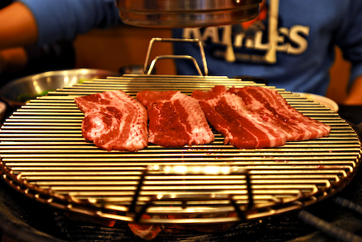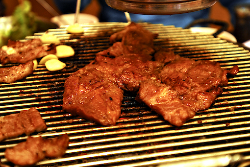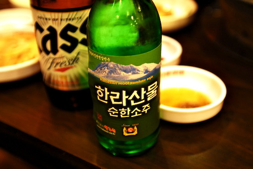 전체적으로 가게는 숯불구이집 답더군요. 숯불구이 냄새가 적당히 배어 있는 가운데 자리를 잡고 흑돼지 오겹살을 주문했죠. 소주는 지역 소주 브랜드 한라산물 순한소주를 시켰습니다. 기본찬으로 나오는 것은 서울과 별반 차이가 없었지만 특이한 것은 게장 인심이 아주 넉넉했습니다. 담아주기도 많이 담아주시고 계속 리필도 해주시더군요. 우리의 게장 귀신 토양이님이 제일 잘 드시더만요.
